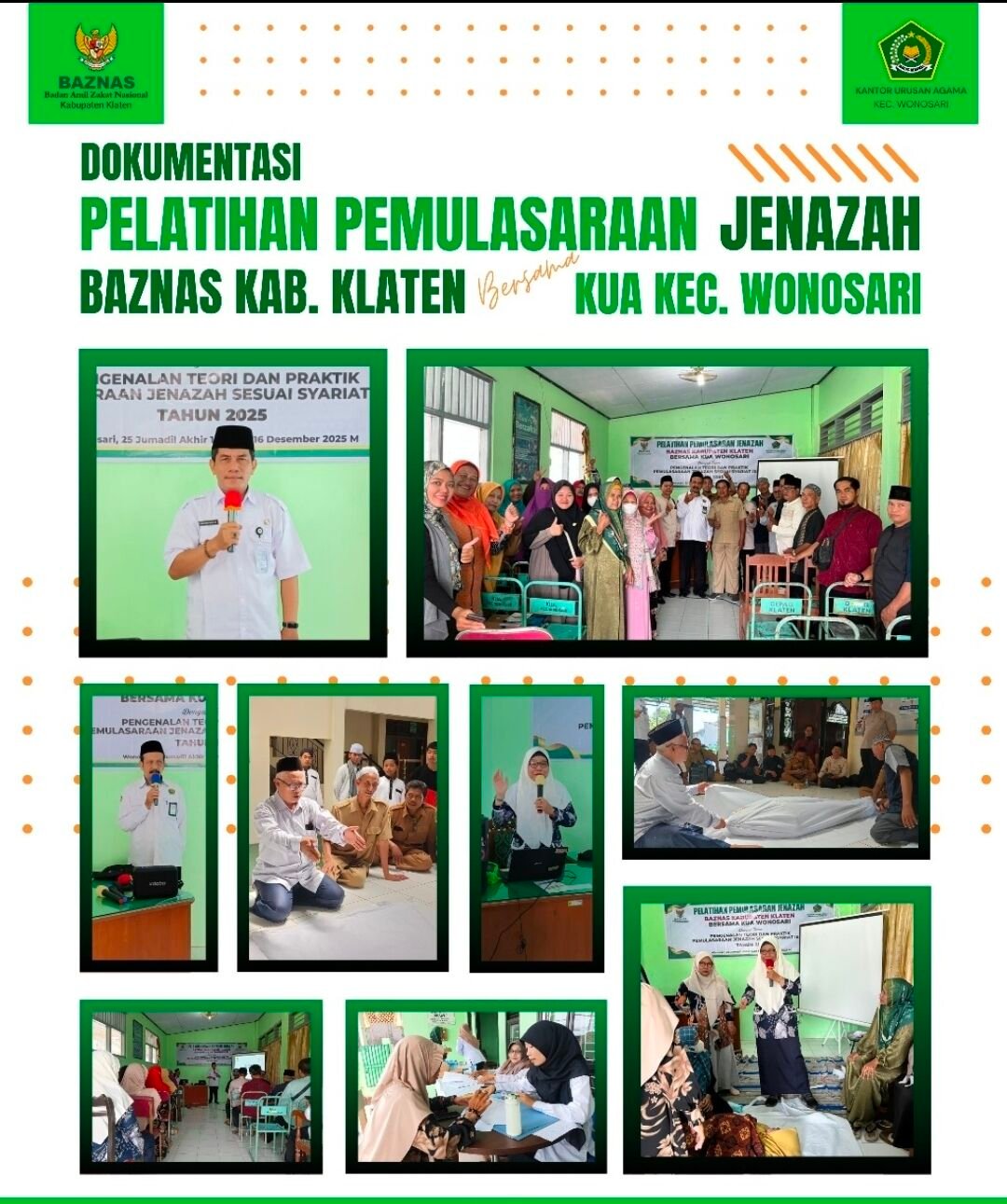 Klaten (16/12) – Kantor Urusan Agama (KUA) Kecamatan Wonosari bekerja sama dengan Badan Amil Zakat Nasional (BAZNAS) Kabupaten Klaten sukses menyelenggarakan kegiatan “Pelatihan Pemulasaraan Jenazah” pada Selasa, 16 Desember 2025 (25 Jumadil Akhir 1446 H). Kegiatan ini bertujuan untuk memberikan pemahaman mendalam serta keterampilan praktis kepada masyarakat mengenai tata cara pengurusan jenazah yang sesuai dengan syariat Islam.