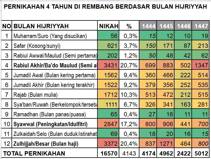 Penulis telah menganalisis data pernikahan yang diambil dari SIMKAH gen. 4 di Kabupaten Rembang, mulai bulan Oktober 2022-Maret 2026 M. Data ini bertepatan dengan Rabi’ul Awwal 1444-Syawwal 1447 H. Adapun untuk menggenapi data selama 4 tahun hijriyyah, seperti Muharram dan Safar 1444 H, serta Syawwal-Dzulhijjah 1447 H diambil dari rata-rata tiga tahun lainnya. Data pernikahan September 2022 M dan sebelumnya tidak bisa dianalisa, karena SIMKAH generasi sebelumnya sementara tidak bisa diakses.